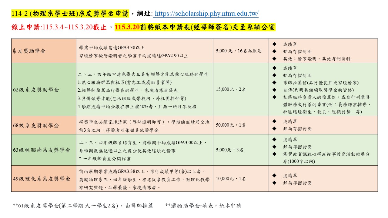114-2 (物理系學士班)系友獎學金申請,網址: https://scholarship.phy.ntnu.edu.tw/